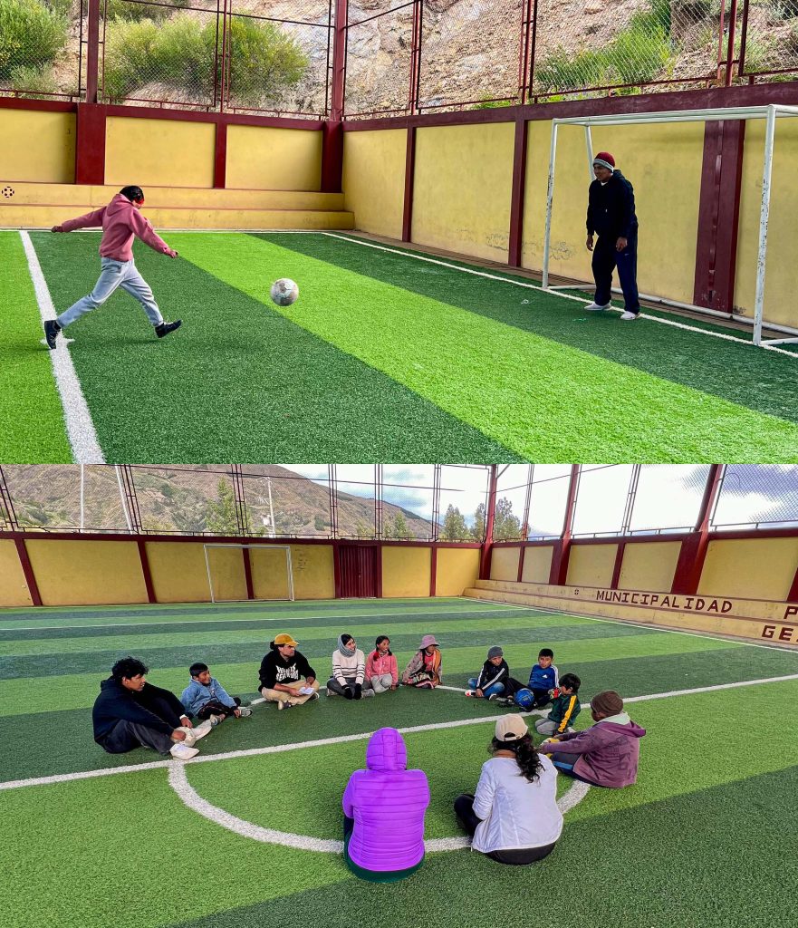 En la cancha nos esperaban Jordy, Joselino, Neymar, Milky, Annita, Ani y Sebastián, que apenas tiene tres años. Jugamos fútbol primero y luego hicimos el taller: les pedimos que dibujaran su comunidad y cómo se veían dentro de ella. En los papeles aparecieron casas de adobe, cerros verdes, flores gigantes y niños jugando. Era un mundo sencillo, pero completo. Cerramos recordándoles que todo eso que aman es un regalo y que Dios también habita ahí.