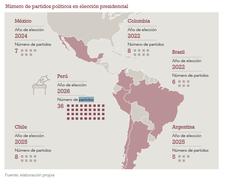 La debilidad extrema de los partidos tiene efectos muy serios; uno de los más visibles es la fragmentación electoral. Si comparamos las últimas elecciones presidenciales en las principales economías de América Latina, el contraste con Perú es evidente.